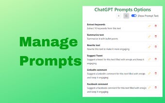 ChatGPT Prompts를 사용하면 브라우저에 프롬프트를 추가, 편집 또는 삭제하고 저장할 수 있는 기능을 갖추게 됩니다. 기본 프롬프트에는 키워드 추출, 요약 및 텍스트 재작성, 트윗 및 LinkedIn 및 Facebook 댓글 제안과 같은 작업이 포함되어 있습니다. 이 도구는 최첨단 자연어 처리 기술을 활용하여 정확하고 효율적인 결과를 제공합니다.